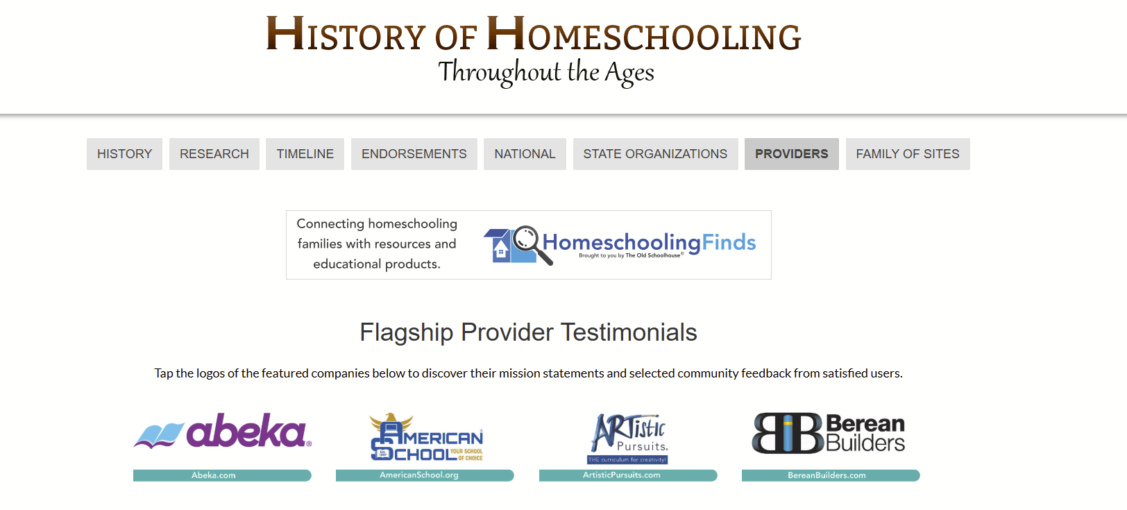 - Your company will be included HERE on our History of Homeschooling website. Your logo will be located under the Flagship Provider Testimonials section on that page.